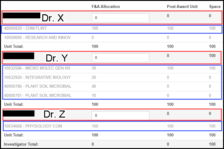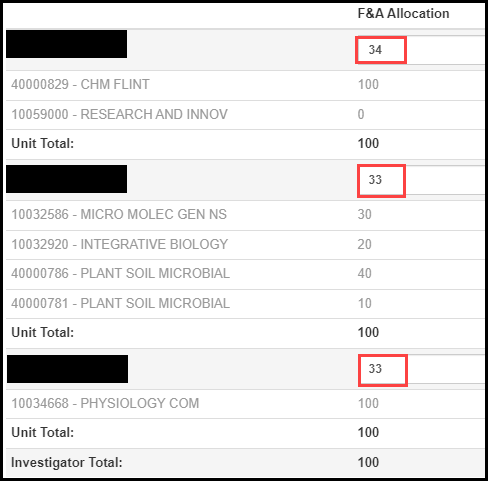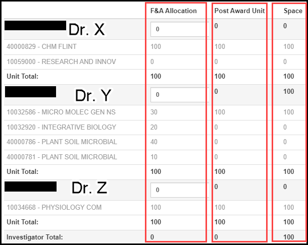 - If none of the investigators have space credit, the percentages in the Space column will match the percentages in the F&A Allocation column.