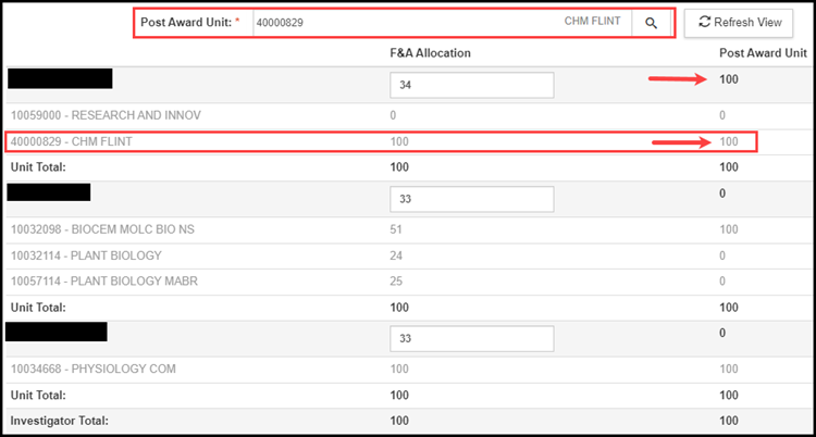 Post Award Unit column ‐ The column that displays the Post Award Unit that will be responsible for bookkeeping should the proposal be funded. The Post Award Unit is identified by 100 in the Investigator line and 100 in the Unit Credit line underneath that investigator.